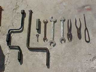 Grease gun, oil can, axle drain plug key, sump drain plug key